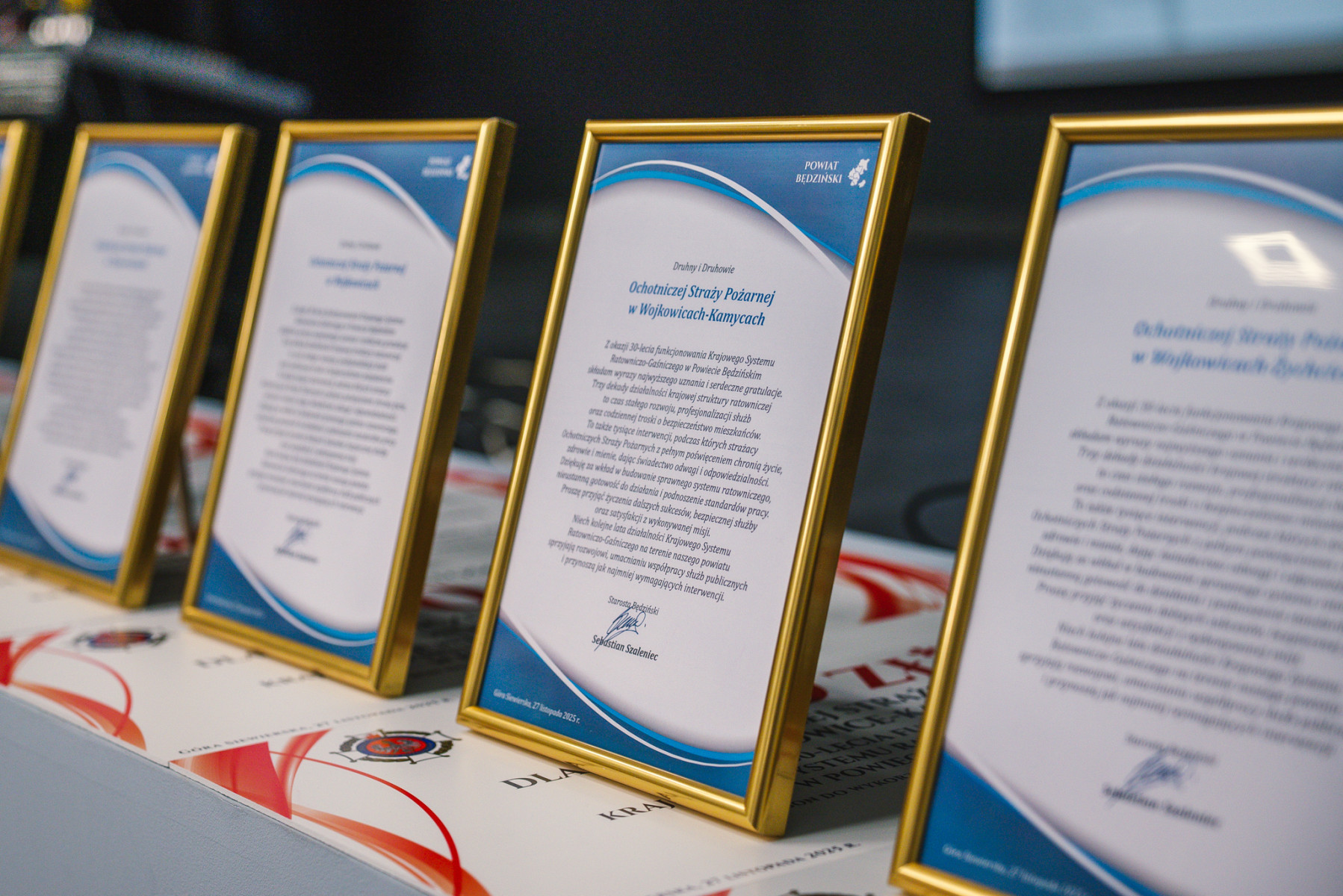 W trakcie uroczystości Starosta Będziński Sebastian Szaleniec wraz z Członkiem Zarządu Powiatu Będzińskiego Zdzisławem Banasiem wręczył okolicznościowe podziękowania i bony podarunkowe dla jednostek OSP.
