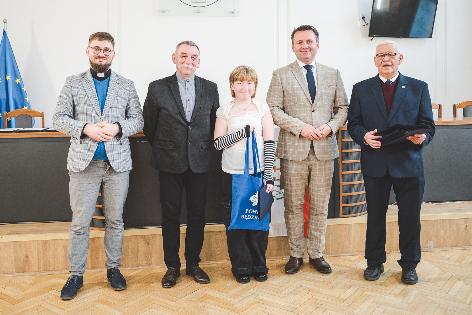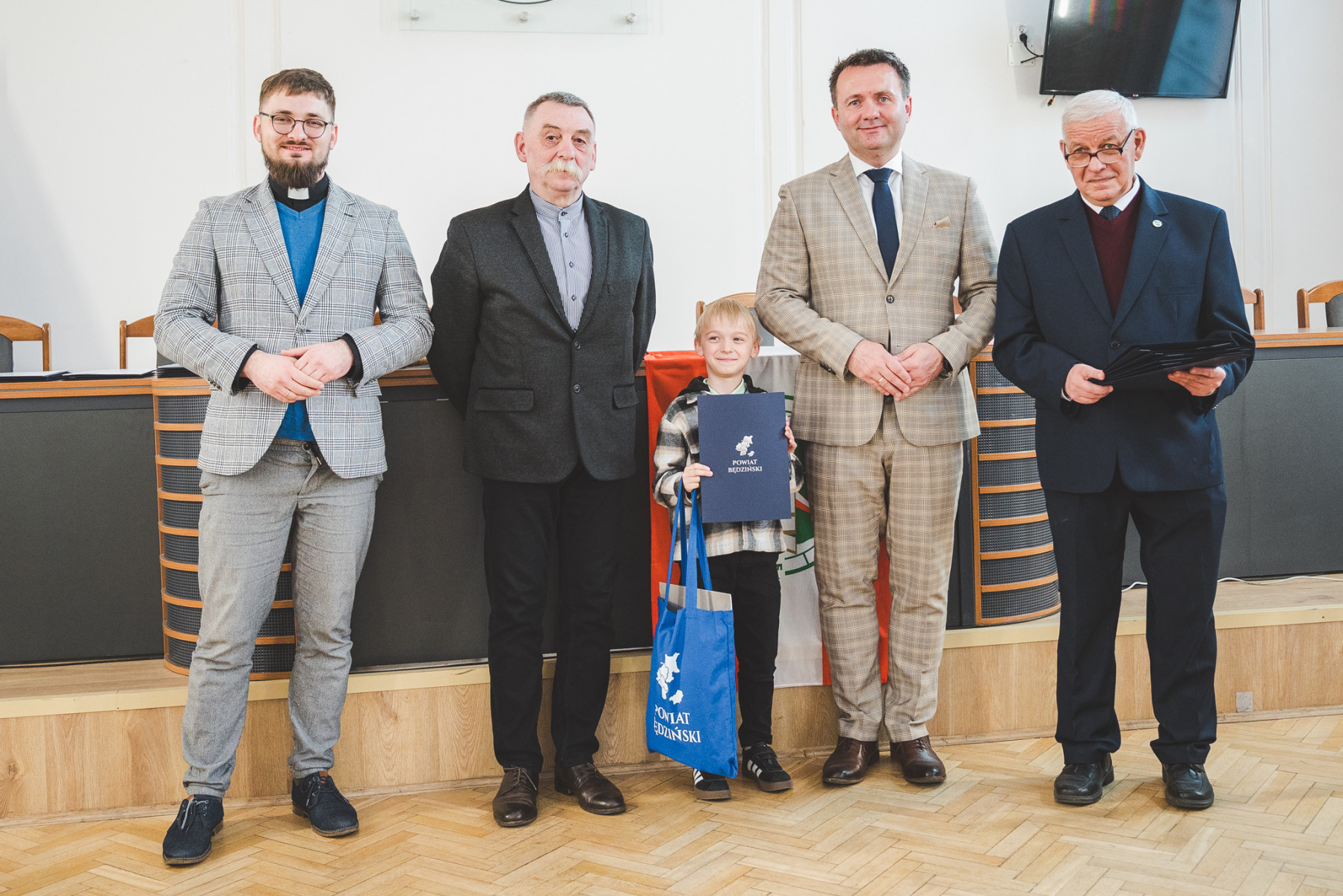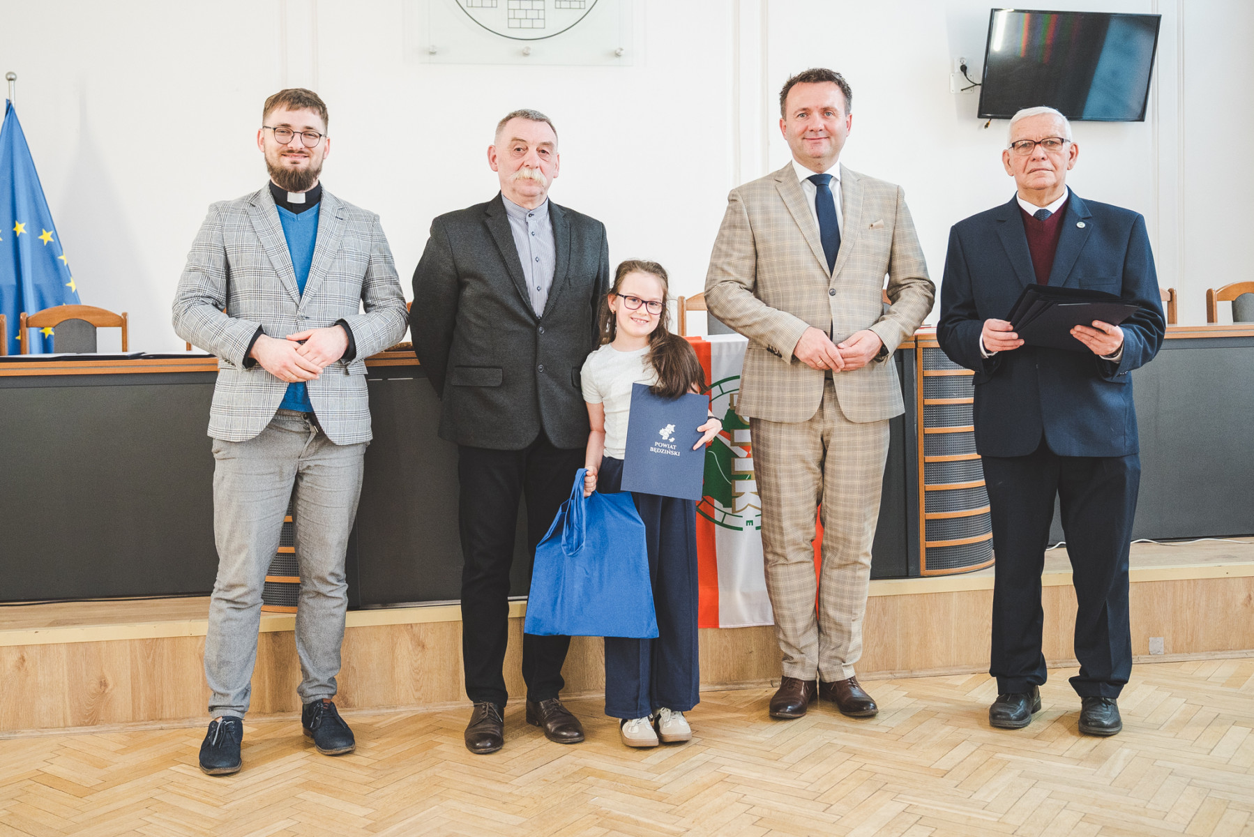 Nagrody młodym artystom wręczyli wspólnie: Starosta Będziński Sebastian Szaleniec, Przewodniczący Rady Powiatu Będzińskiego Jan Powałka, prezes oddziału PTTK Marek Łebzuch oraz przedstawiciel Wydziału Katechetycznego Diecezji Sosnowieckiej ks. Karol Latos.
