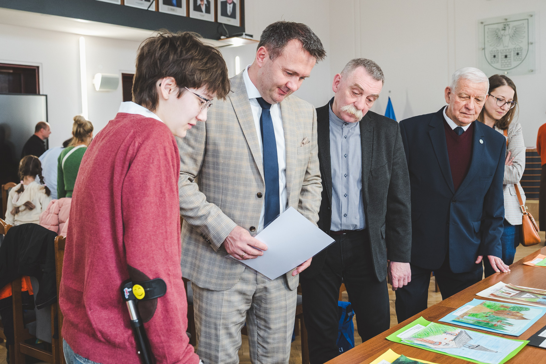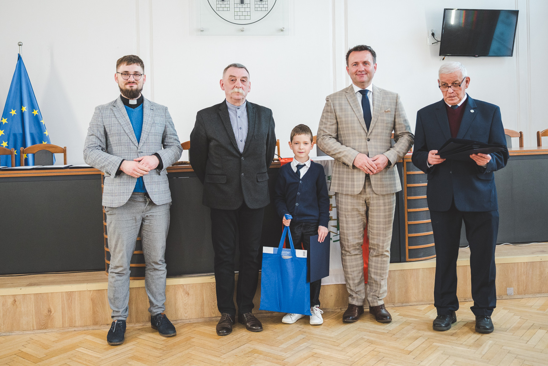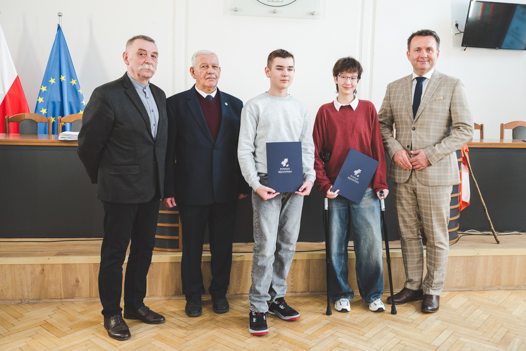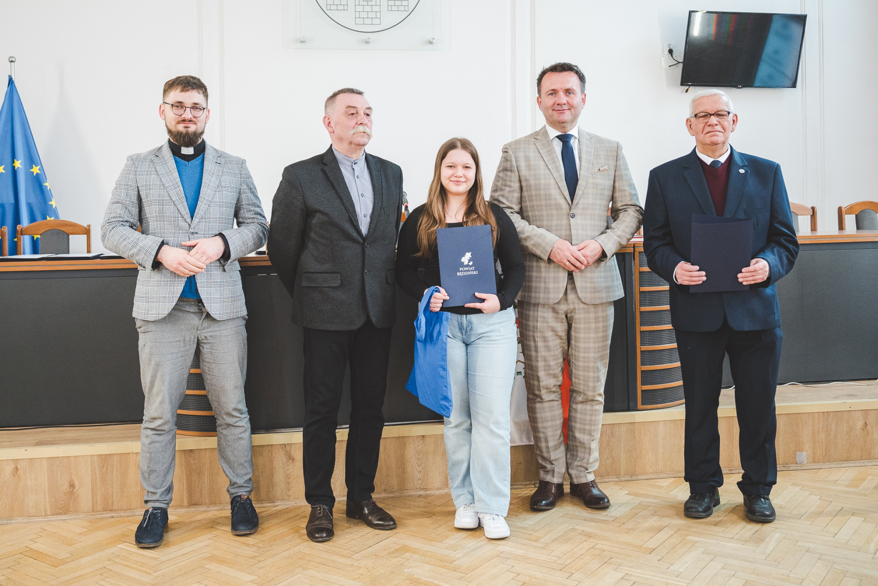 Nagrody młodym artystom wręczyli wspólnie: Starosta Będziński Sebastian Szaleniec, Przewodniczący Rady Powiatu Będzińskiego Jan Powałka, prezes oddziału PTTK Marek Łebzuch oraz przedstawiciel Wydziału Katechetycznego Diecezji Sosnowieckiej ks. Karol Latos.